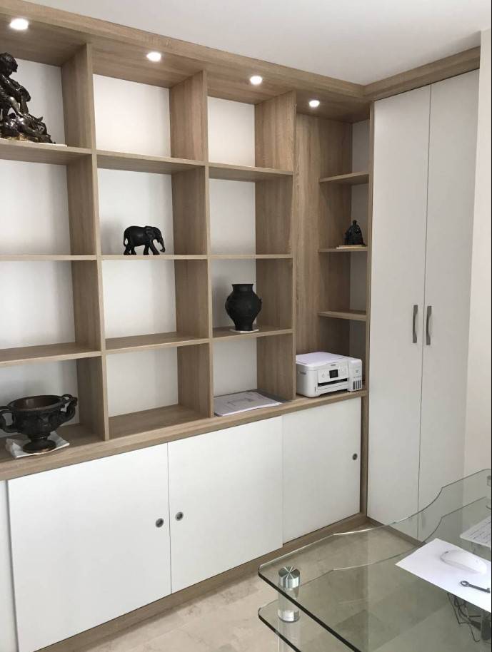 Dans ce projet sur mesure, nous avons conçu un espace de travail fonctionnel en intégrant des solutions discrètes pour dissimuler les équipements (ordinateur, imprimante), tout en conservant une esthétique épurée.