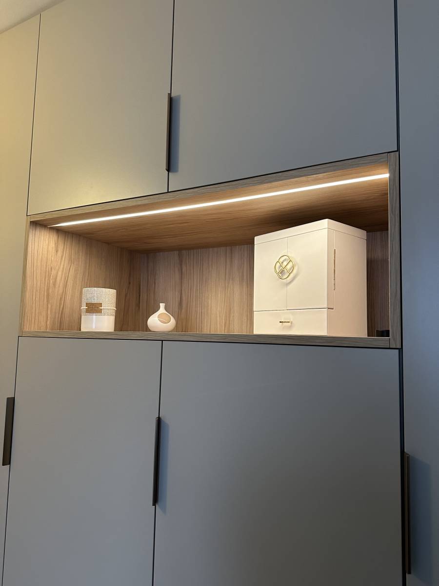Dans cette réalisation à Olivet, nous avons conçu un dressing en angle avec portes battantes, parfaitement intégré à l’architecture intérieure. L’aménagement optimise chaque centimètre grâce à une conception ergonomique et des finitions haut de gamme. L’ensemble est sublimé par un éclairage LED intégré, offrant à la fois une mise en valeur esthétique et un confort d’utilisation optimal.