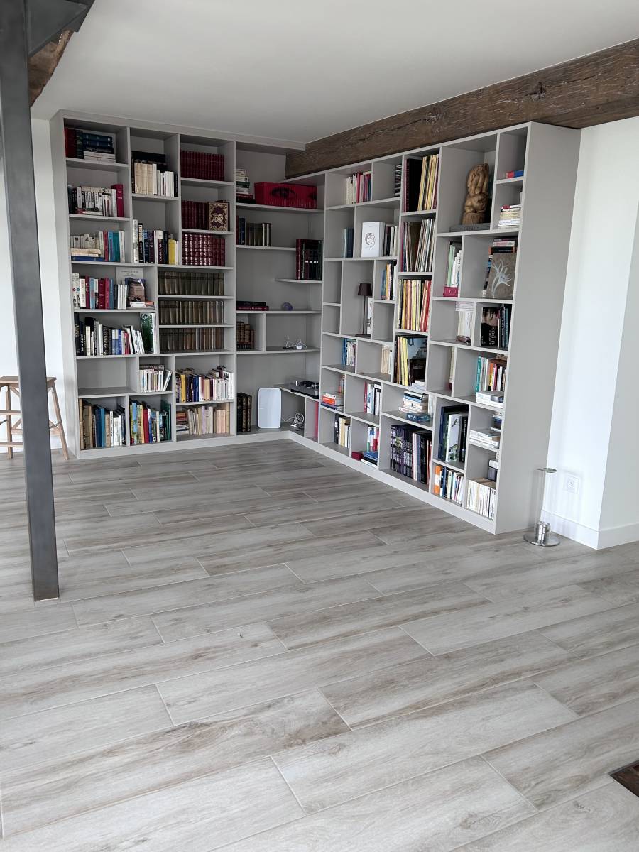 Voici une magnifique réalisation, faite à Jargeau, d'une bibliothèque sur mesure à faible profondeur, idéale pour ranger vos livres et décoration, tout en créant un coin détente et lecture. Conçue avec deux hauteurs différentes pour intégrer la poutre qui traverse la pièce, elle allie fonctionnalité et esthétique. L'effet suspendu dans l'angle de la bibliothèque ajoute une touche de légèreté et de modernité à l'ensemble, rendant l'espace plus aéré et agréable.